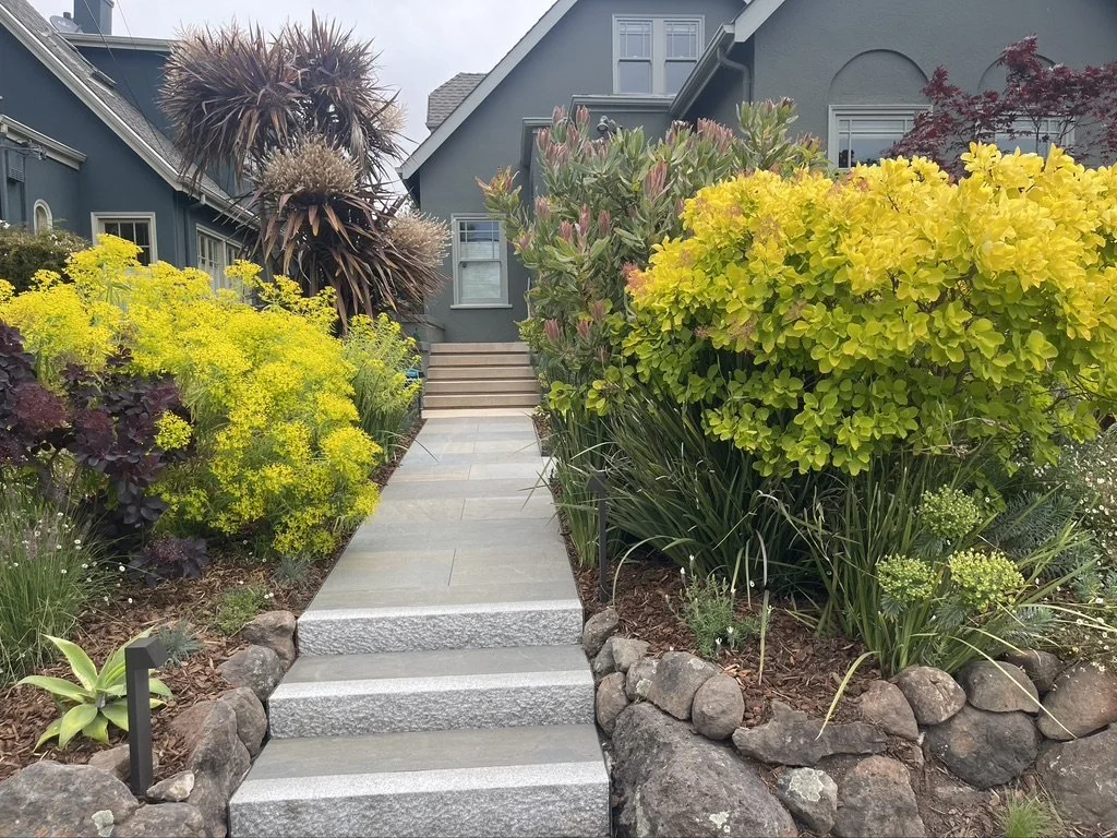 This Berkeley landscape design creates a harmonious and whimsical blend of stone, metal, and wood, transforming the outdoor space into a captivating retreat. The pathways, framed by natural stone and delicate metal accents, meander through lush gardens, evoking a sense of serenity and wonder. The thoughtful use of wood adds warmth and texture, seamlessly tying together the natural elements.