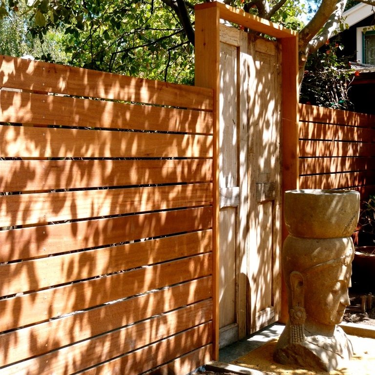 In the backyard, we reshaped a once dark, unstructured space into a bright, flowing garden that seamlessly connects the home to the outdoors. Three crushed granite courtyards were framed by custom concrete planters, while a modern horizontal fence paired with restored mid-century Mexican doors creates a perfect blend of past and present, resulting in a timeless, inviting garden.