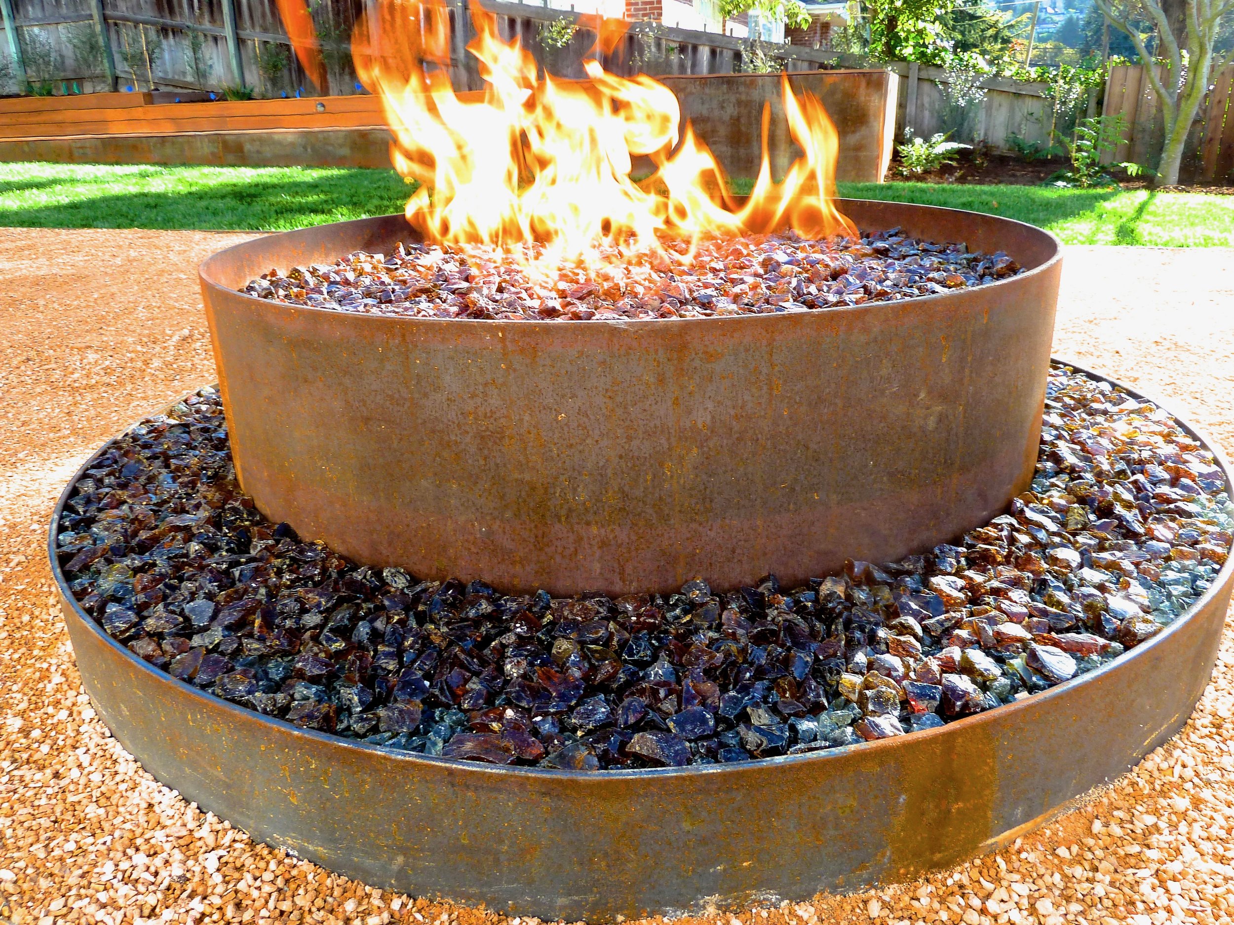 The terraced site now offers three functional garden areas. The first level features a spacious stone courtyard, complete with wraparound benches and stone counters, ideal for dining and entertaining. A steppingstone path on a smaller lawn leads to an elevated decomposed granite courtyard, outfitted with a gas bonfire and lounge furniture, creating a cozy gathering space.